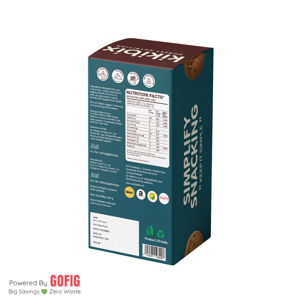 Kikibix is a clean-label snack brand committed to making healthy eating fun, delicious, and convenient. We craft 100% baked, wholesome snacks made with real ingredients - no maida, no refined sugar, no preservatives, and no palm oil. From nutrient-packed cookies to guilt-free savoury bites, every Kikibix product is thoughtfully made to balance taste and nutrition. Our goal is simple - to help you snack smarter without compromising on flavor.