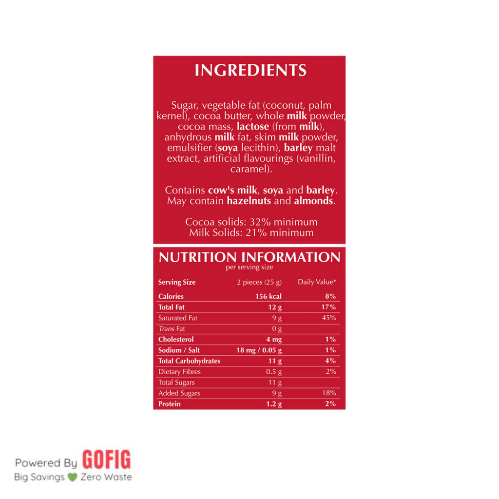sugar, vegetable fat (coconut, palm kernel), cocoa butter, whole milk powder, cocoa mass, lactose (from milk), anhydrous milk fat, skim milk powder, emulsifier (soya lecithin), barley malt extract, artificial flavourings (vanillin, caramel)