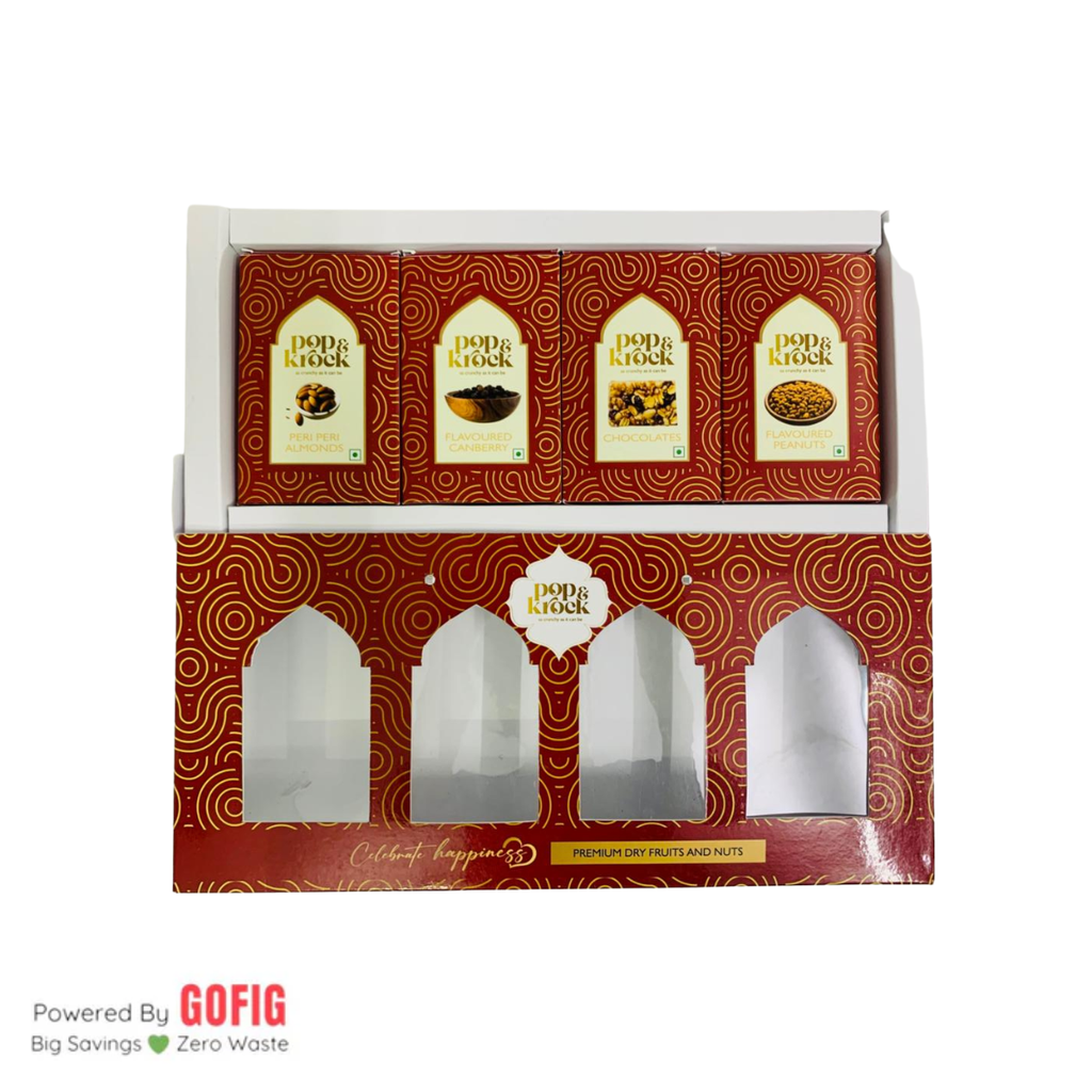 Assorted Premium Dry Fruits & Nuts – Includes a rich selection such as almonds, cashews, peanuts, cranberries, and raisins in exciting flavours like peri-peri, black pepper, and chatpata.