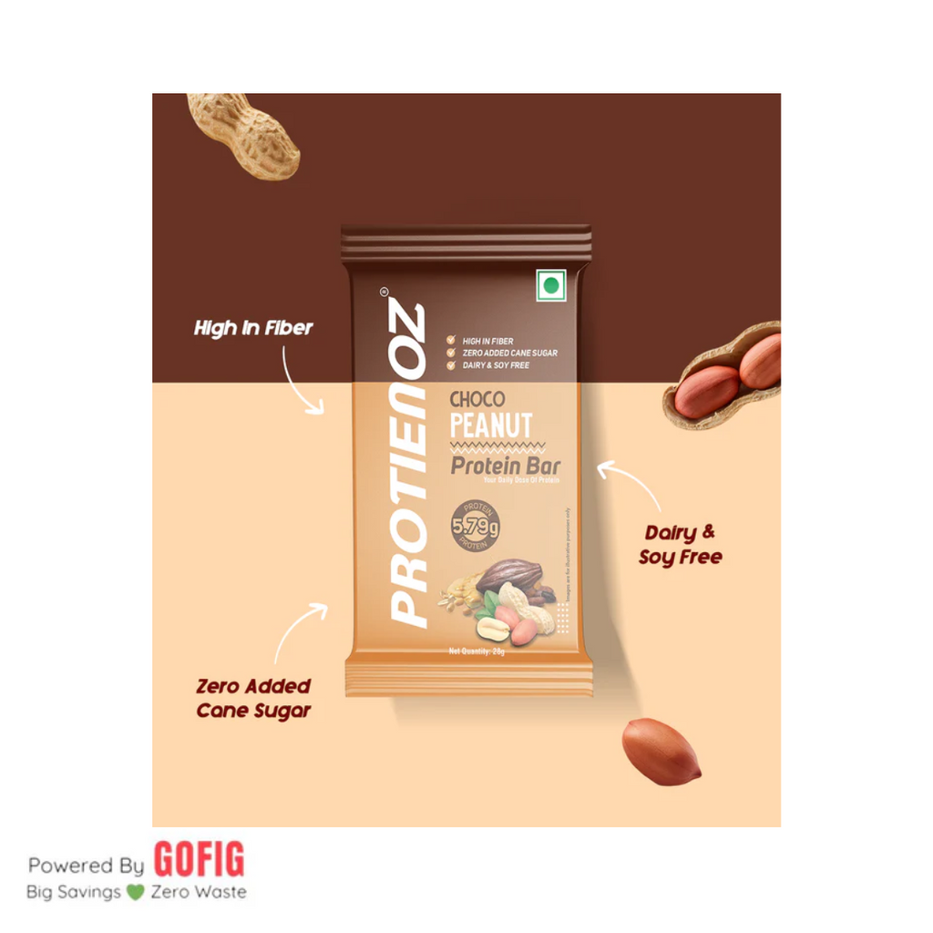The Proteinoz Choco Peanut Protein Bar (28 g) offers a tasty blend of rich cocoa and crunchy roasted peanuts, providing a satisfying protein boost. Perfect for on-the-go energy, this bar combines flavor and nutrition to support your active lifestyle.