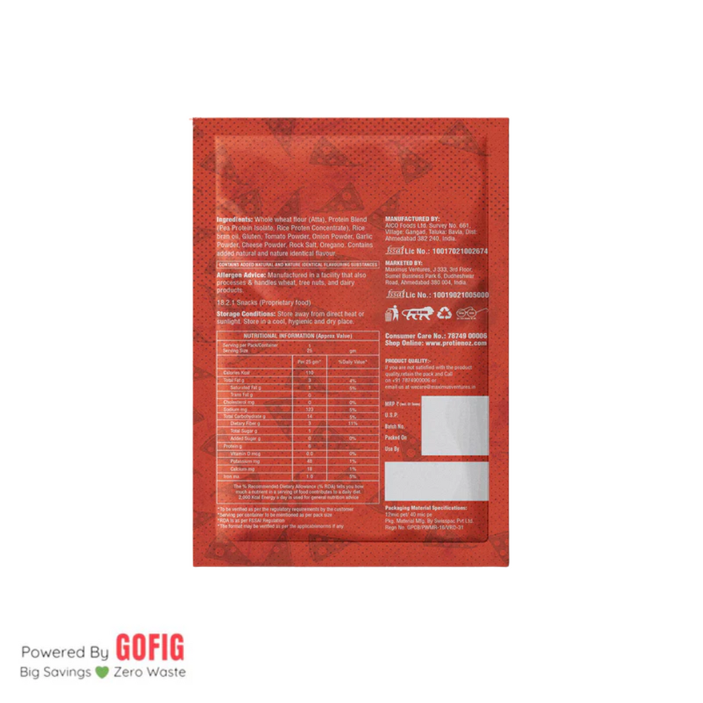 Whole wheat flour (Atta), Protein Blend (Pea Protein Isolate, Rice Protein Concentrate), Rice bran oil, Gluten, Tomato Powder, Onion Powder, Garlic Powder, Cheese Powder, Rock Salt, and Oregano.