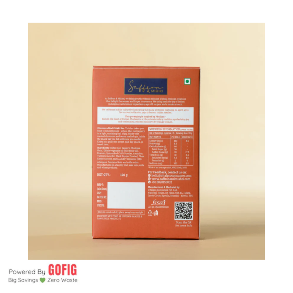 Experience the authentic crunch of our Saffron & Mishri Churmura Bhel Chikki Bar, a 100-gram celebration of traditional Indian confectionery craftsmanship. This artisanal creation combines the delicate crispness of churmura and bhel with the brittle texture of chikki, elevated by aromatic saffron and the refined sweetness of mishri. Each bite delivers a harmonious interplay of textures and flavors rooted in time-honored recipes. Rich in the wholesome goodness of traditional ingredients, this bar offers a nostalgic yet sophisticated snacking experience. Perfect for those who value authentic taste and quality craftsmanship in every indulgence.