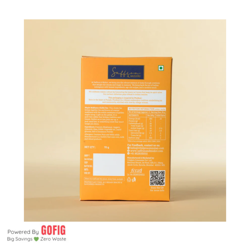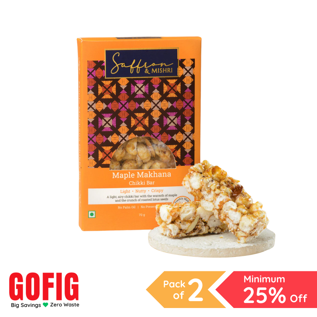 Savor the refined elegance of our Saffron & Mishri Maple Makhana Chikki Bar, a 100-gram masterpiece that seamlessly blends global and traditional flavors. This expertly crafted confection features the delicate crunch of makhana paired with the warm sweetness of maple, enhanced by aromatic saffron and the subtle complexity of mishri. The brittle chikki texture creates a satisfying sensory experience that appeals to the most discerning taste preferences. Makhana brings nutritional benefits alongside its light, airy character, while maple adds a distinctive depth. An exceptional treat for those seeking innovation rooted in quality ingredients and culinary sophistication.