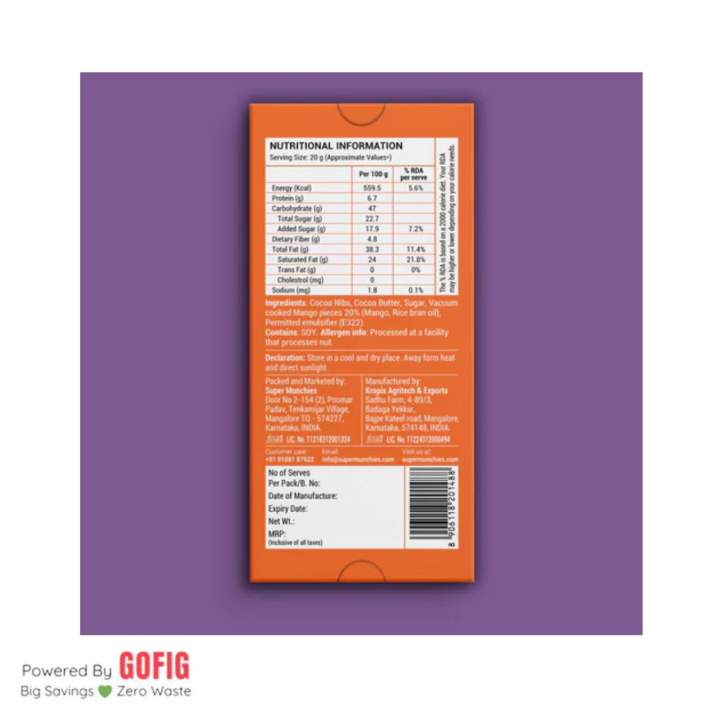 Super Munchies brings together the tropical allure of mango with premium 52% dark chocolate in this 50g indulgence. Each piece delivers a sophisticated blend where rich cocoa meets vibrant mango notes, creating a balanced flavor experience. The 52% cocoa content ensures a smooth, velvety texture without overwhelming bitterness, allowing the fruity undertones to shine through. Perfect for chocolate enthusiasts seeking something beyond conventional flavors, this bar offers a delightful escape with every bite. An ideal treat for those who appreciate quality ingredients and adventurous taste combinations.